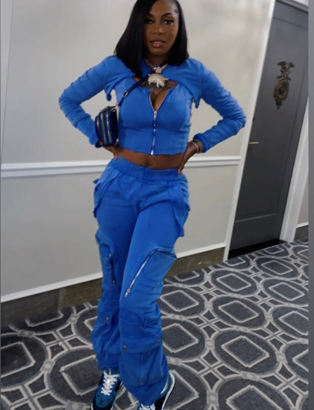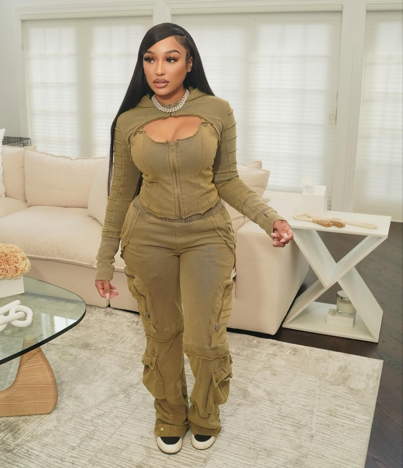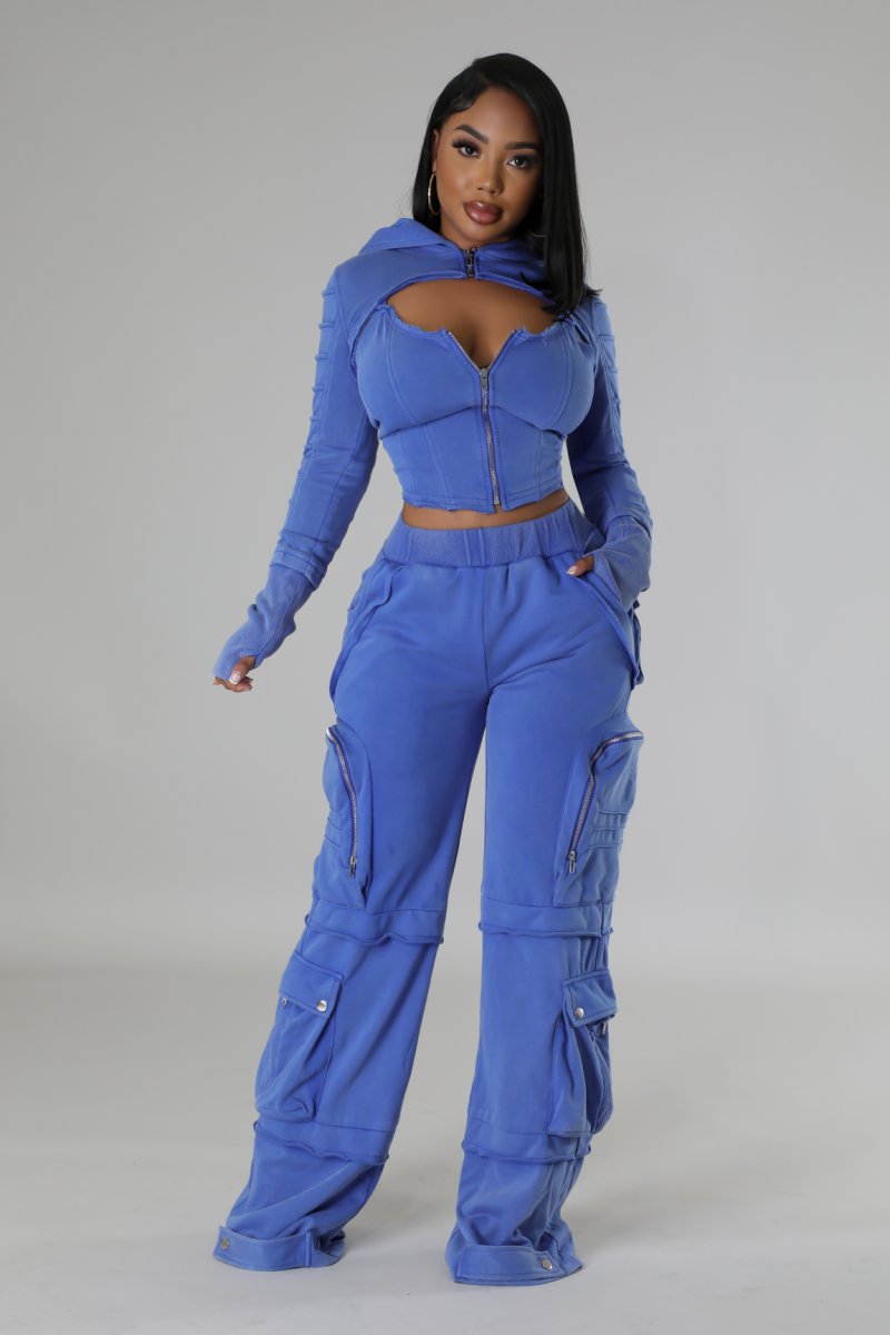 Junto con la chaqueta hay un pantalón de cintura alta a juego que cuenta con generosos bolsillos cargo y cremalleras adicionales, combinando practicidad con vanguardia. Los pantalones se estrechan suavemente en la cintura, creando un ajuste estructurado pero cómodo que es perfecto para un estilo en movimiento.