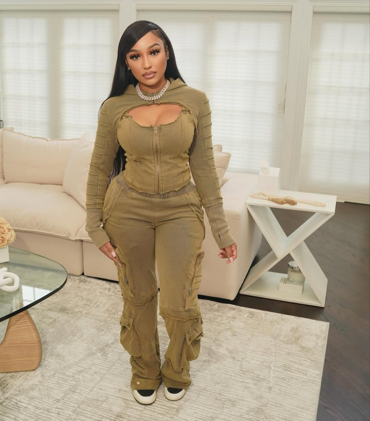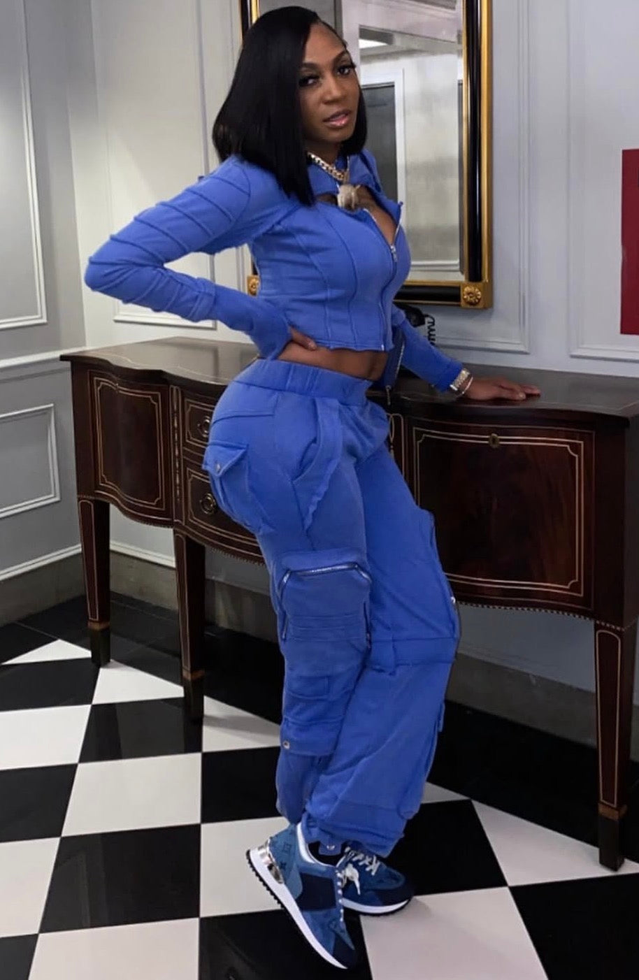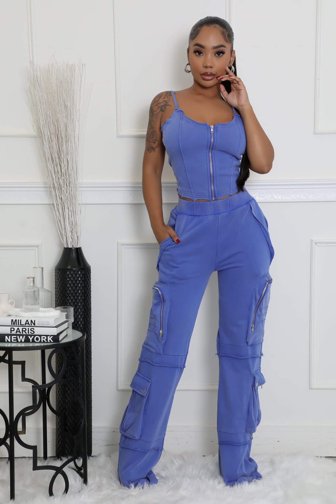 Junto con la chaqueta hay un pantalón de cintura alta a juego que cuenta con generosos bolsillos cargo y cremalleras adicionales, combinando practicidad con vanguardia. Los pantalones se estrechan suavemente en la cintura, creando un ajuste estructurado pero cómodo que es perfecto para un estilo en movimiento.