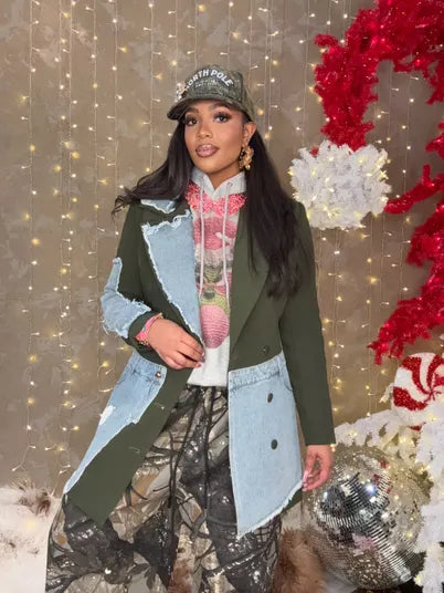 Turn heads with this bold patchwork denim contrast blazer, designed for fashion-forward women who love statement pieces. Featuring a structured longline silhouette, this blazer blends classic tailoring with edgy streetwear vibes. The contrasting denim patchwork panels add texture and visual interest, making it a standout layer for day or night.