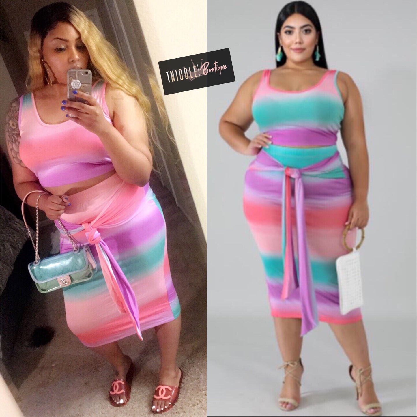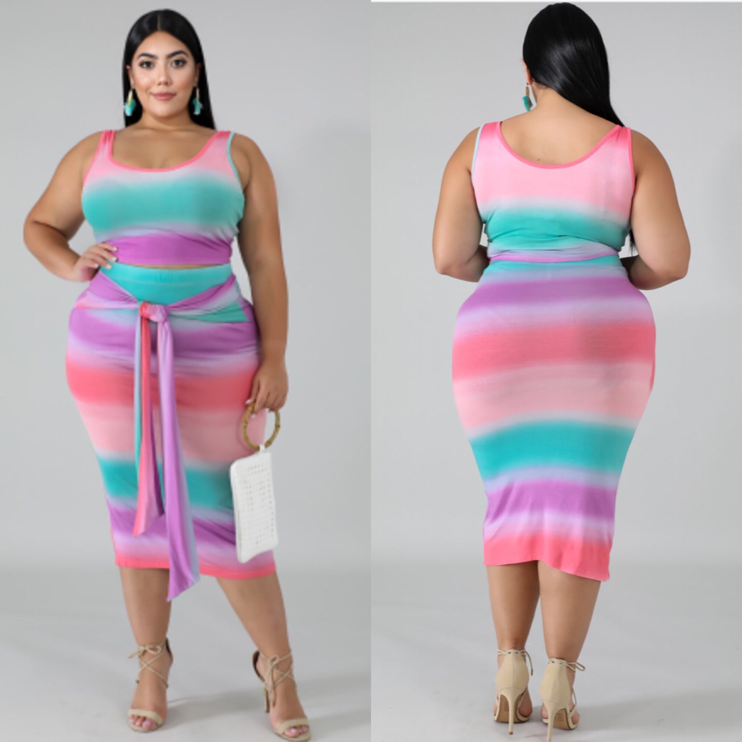 Este hermoso conjunto de falda presenta una tela elástica, un top corto con escote redondo, una falda midi y una correa para atar en la cintura.