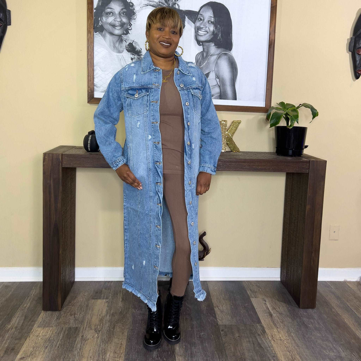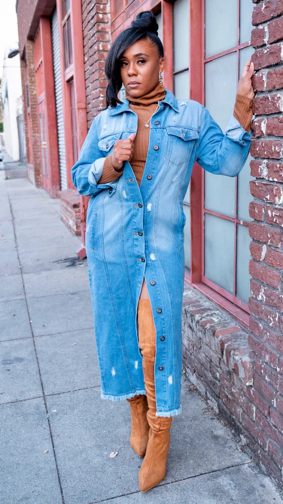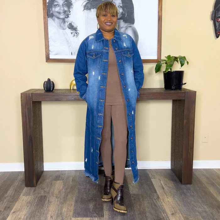 Chaqueta vaquera larga Blue Age, su longitud más larga hace que sea fácil de combinar con casi cualquier cosa, desde jeans y pantalones deportivos hasta monos y vestidos.