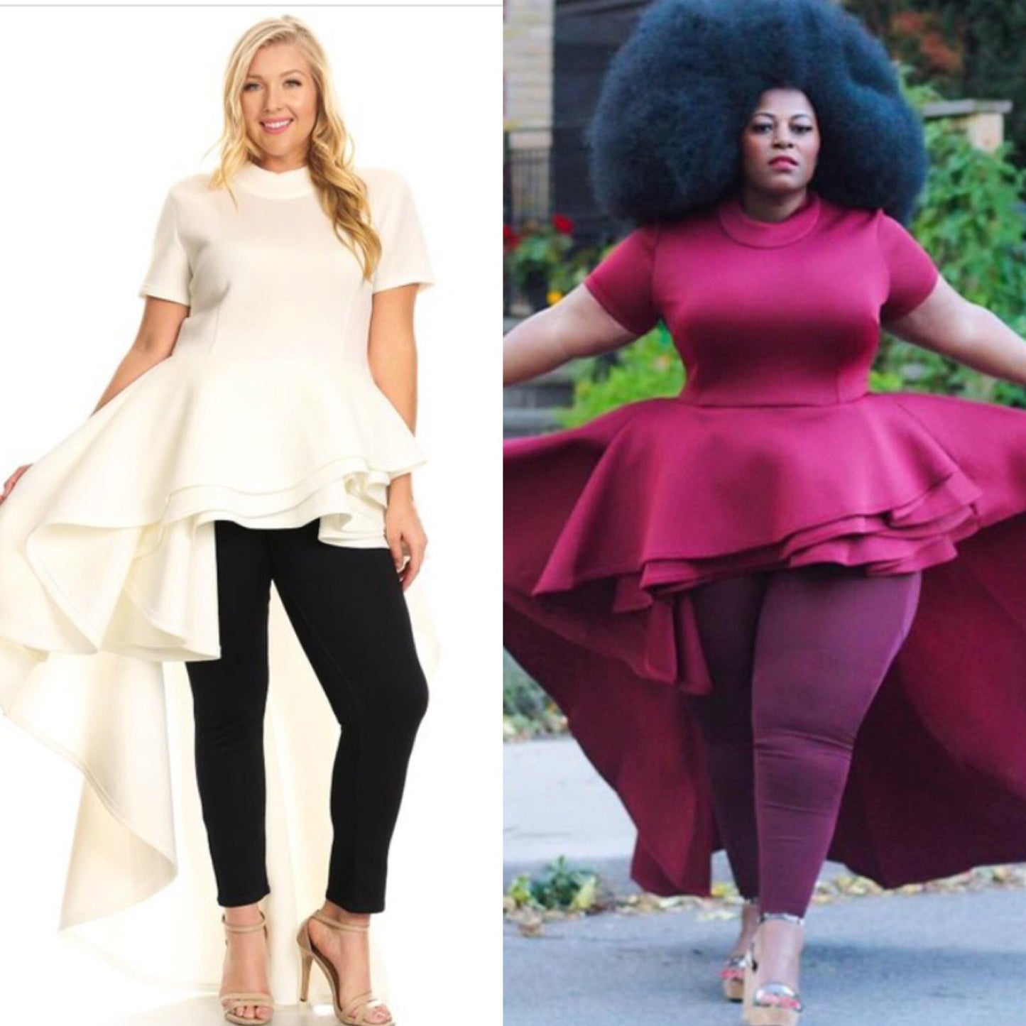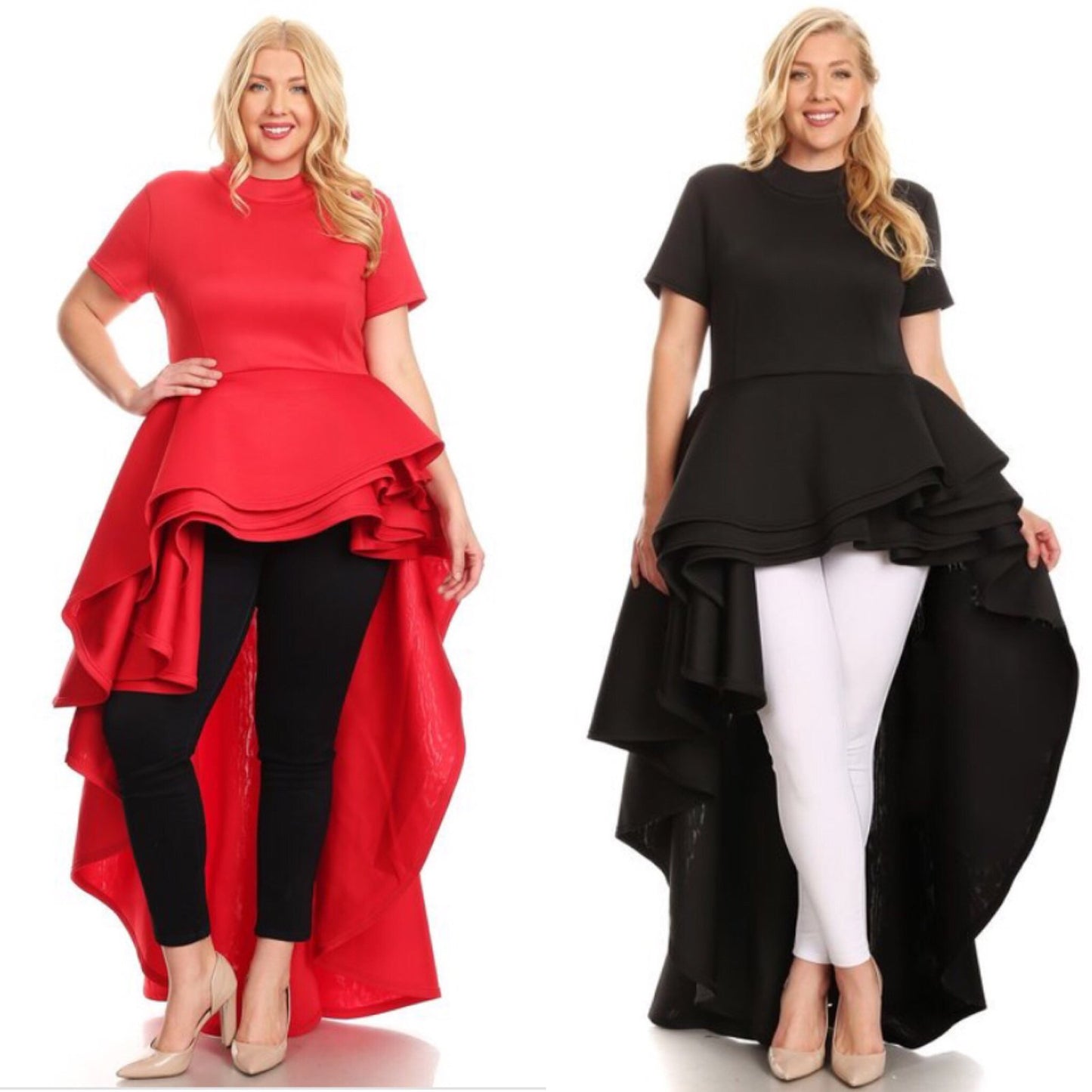 Un top de talla grande que llama la atención, con una cintura peplum con volantes escalonados y una cola ultra baja en la espalda. Confeccionado con cuello alto y tejido de color liso. -