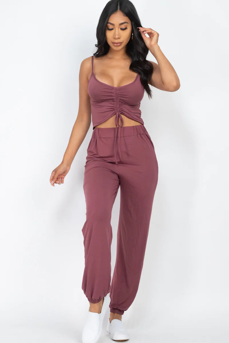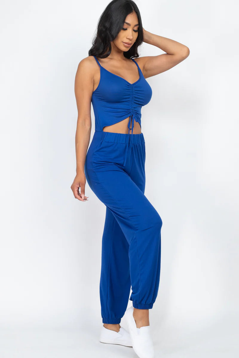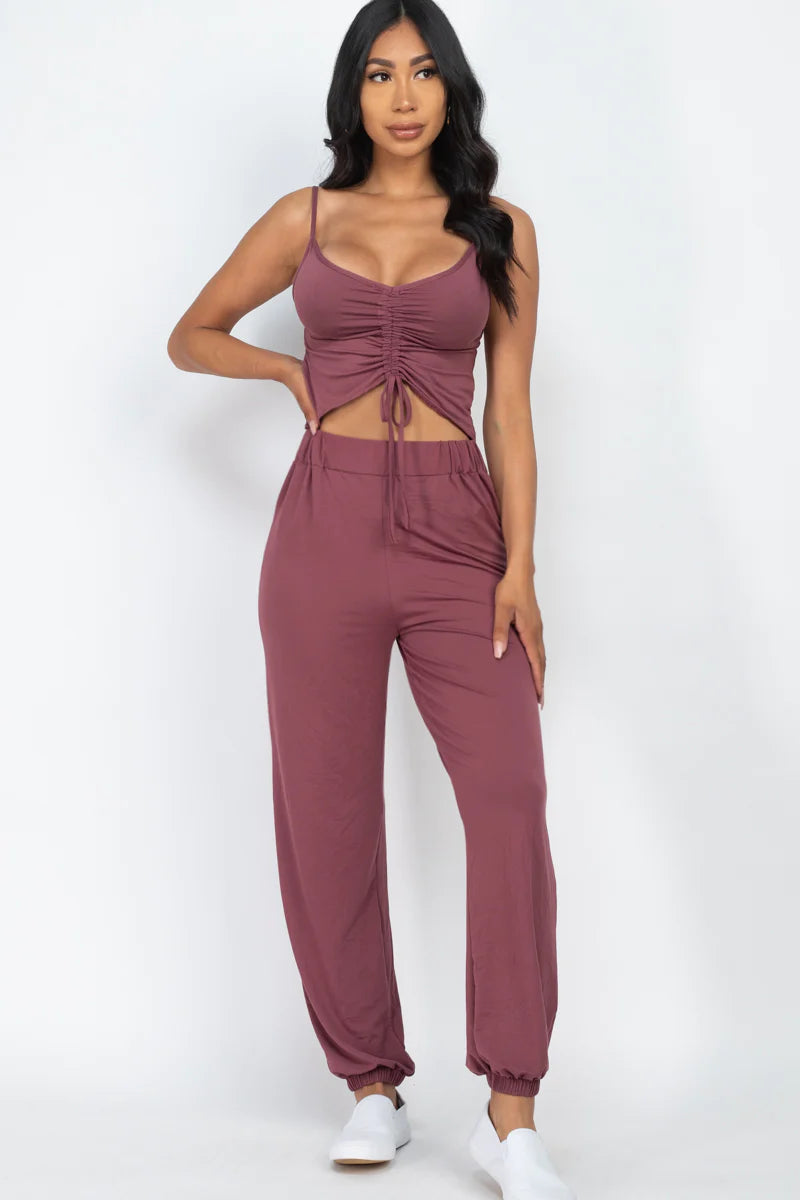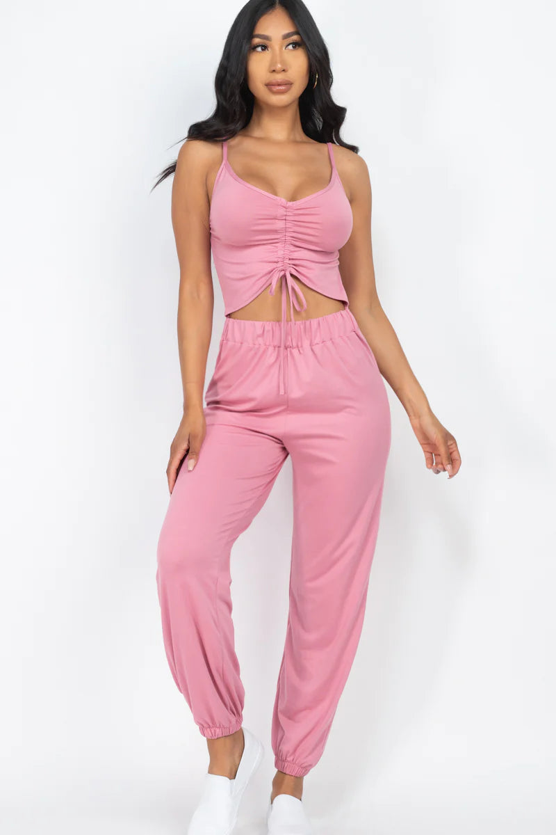 Un mono tipo camisola con un estilo fruncido en la parte delantera y un cordón ajustable.