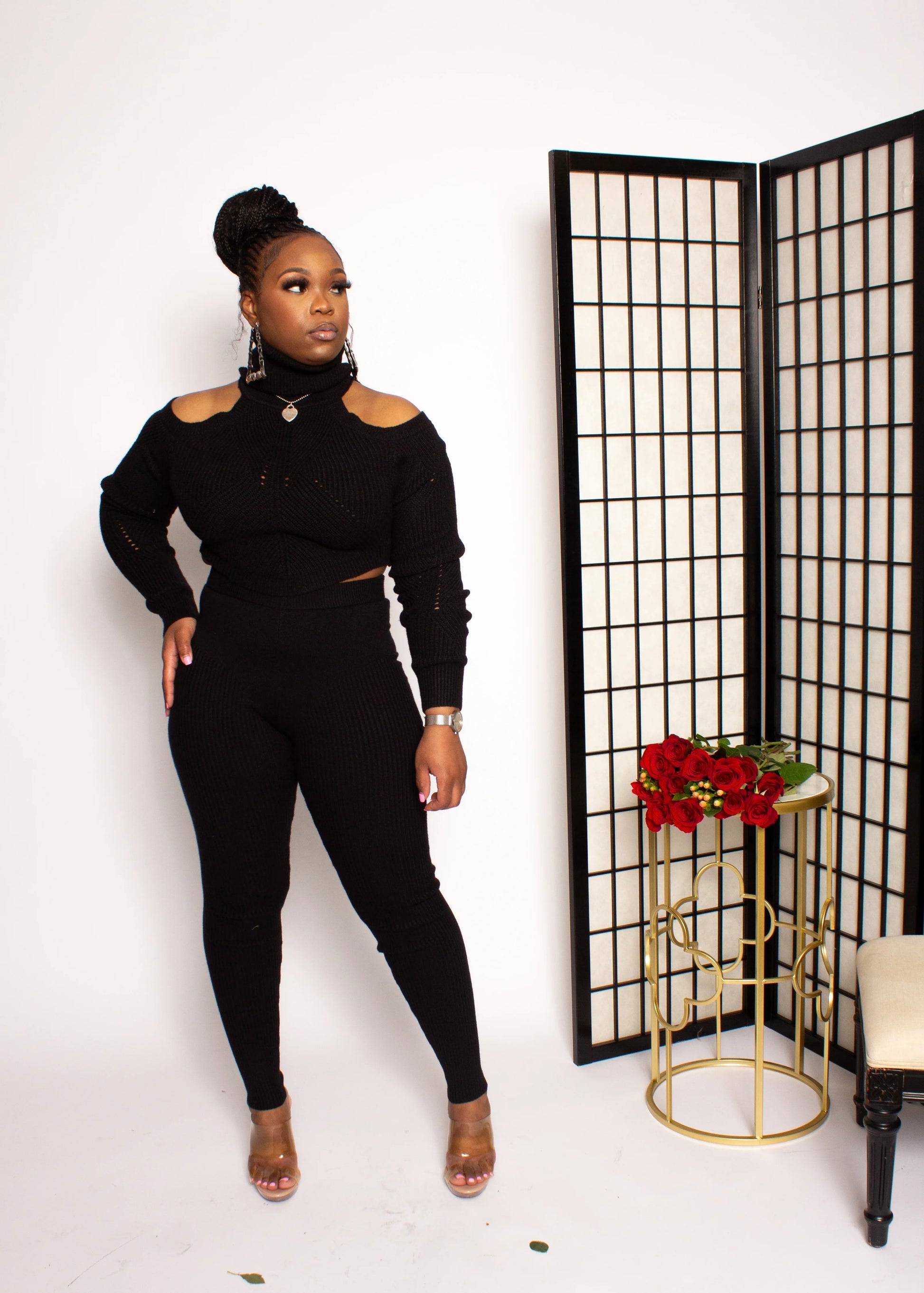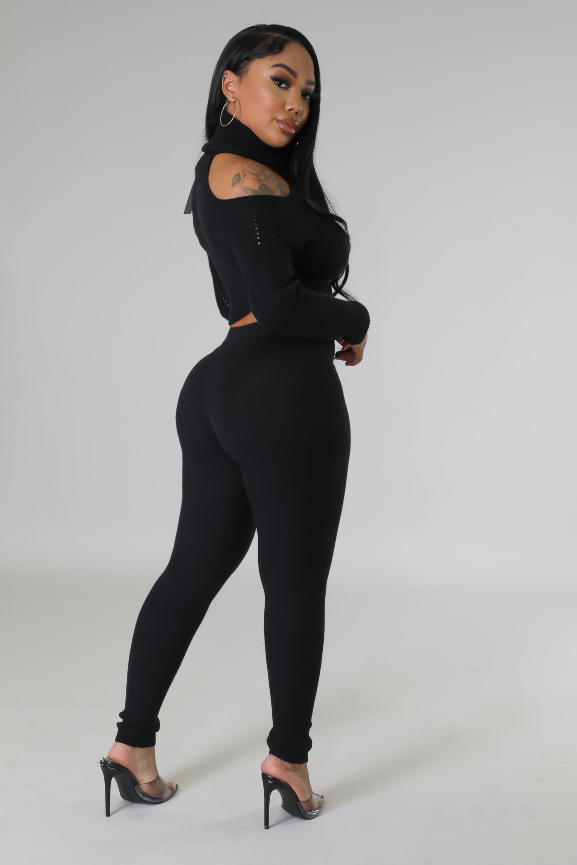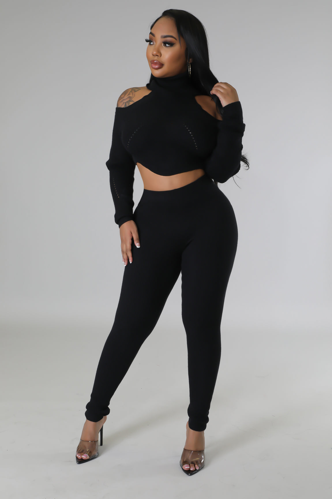 Elevate your style with our Knit Top & Pants Set, available in S, M, and L sizes. This set features a knitted rich fabric that provides both comfort and a touch of sophistication. The open shoulder, long sleeve crop blouse with a turtleneck adds a contemporary flair, while the stretch and skinny fit ensure a flattering silhouette. The pants feature a unique design, completing the chic ensemble.