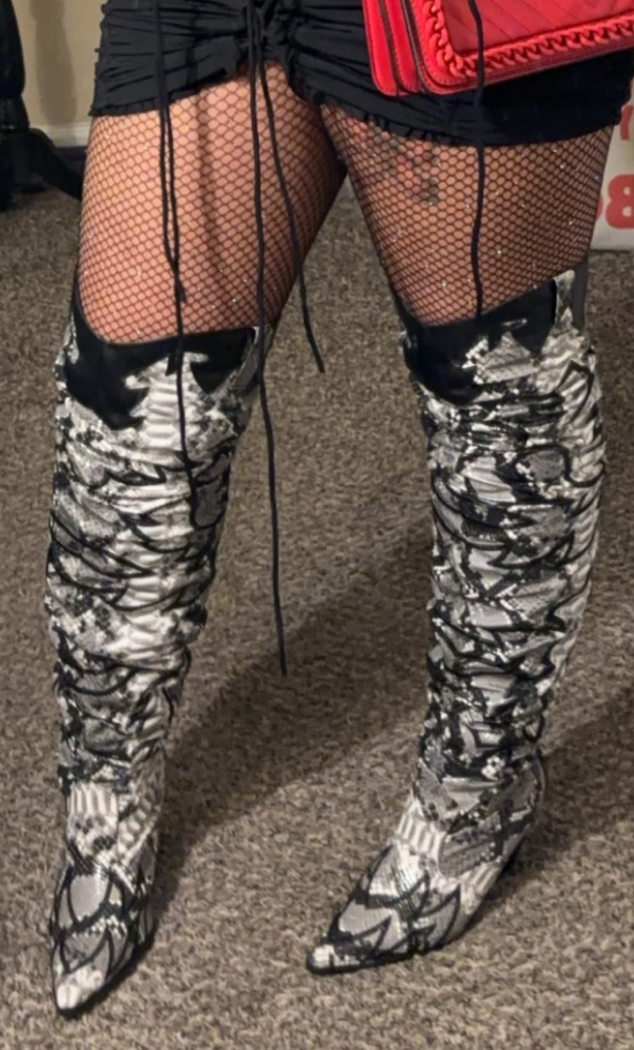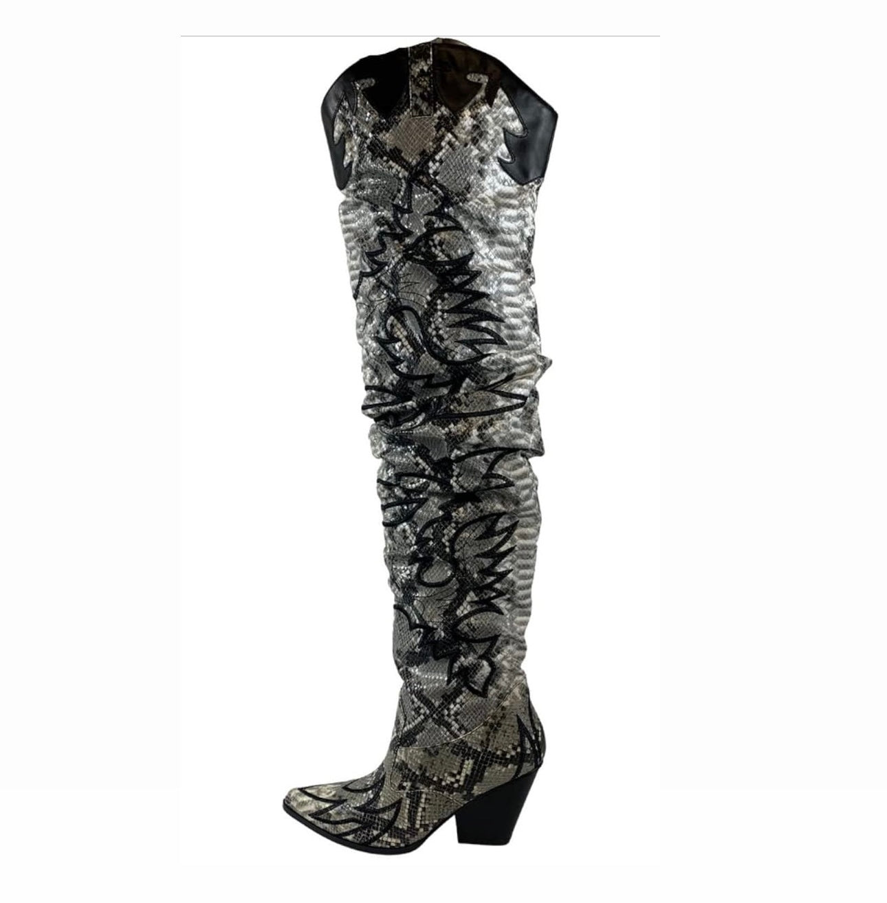 El viejo oeste acaba de recibir una actualización sexy con la bota occidental de tacón grueso Power Trip hasta la rodilla. Con una caña estampada por encima de la rodilla con un ajuste holgado, puntera puntiaguda, tacón cónico grueso, textura de piel sintética y estampado animal en toda la prenda, esta bota de inspiración vaquera hace una declaración por sí sola.