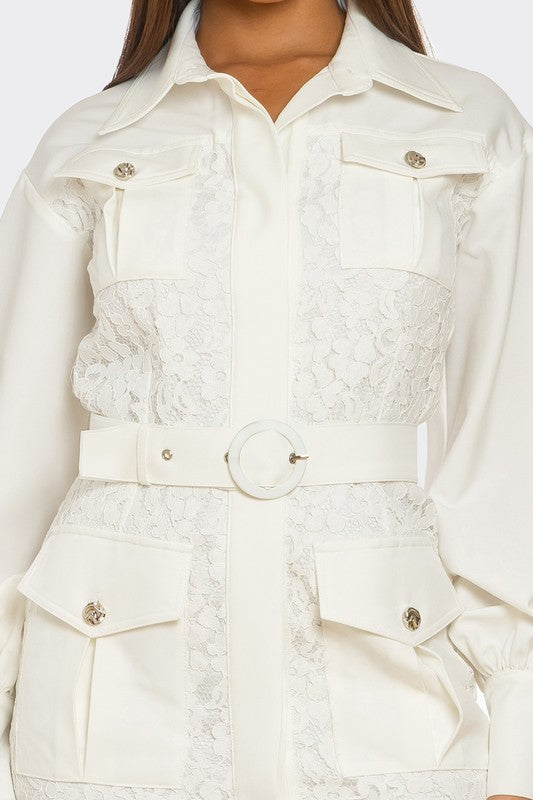 A structured mini dress with a belt and utility pockets adorned with delicate lace, blending romance with practicality.