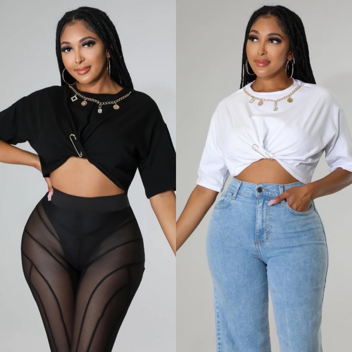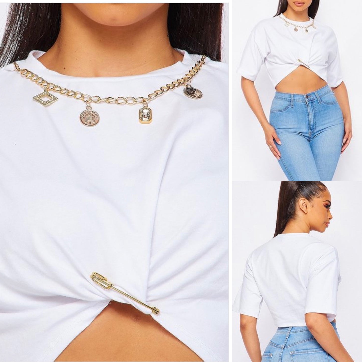 Camiseta corta con colgantes de cadena y adorno de imperdible.