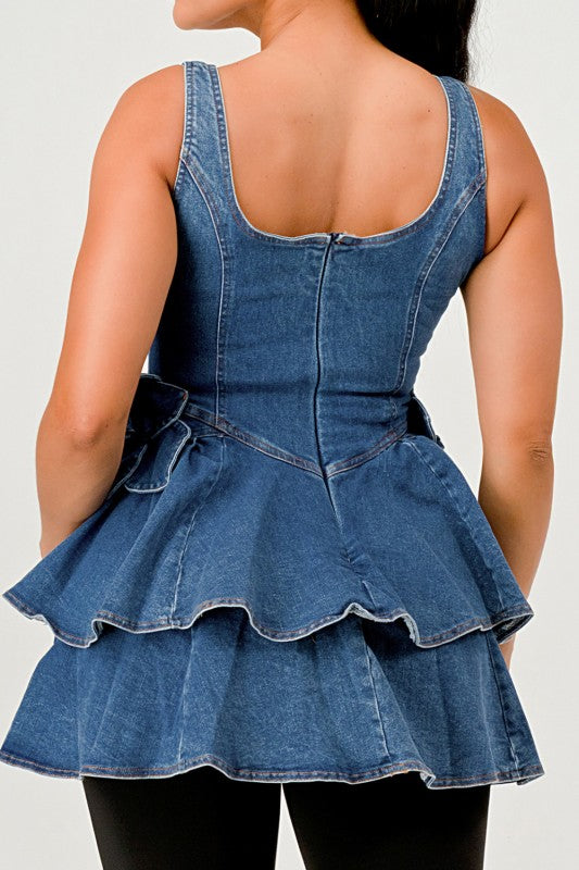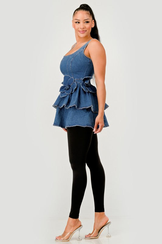 This denim peplum top can be worn as a dress or top. It is designed with a square neckline and fitted bodice for a flattering shape. The layered ruffle tiers create a playful silhouette while the side 3D floral appliques add a feminine touch. Made in a medium wash denim that is versatile and easy to style. Perfect to pair with leggings, jeans, or skirts for both casual and elevated looks.