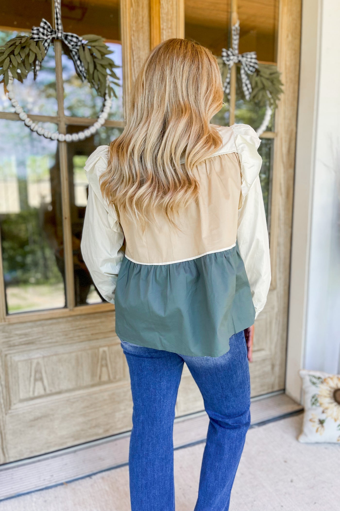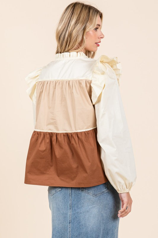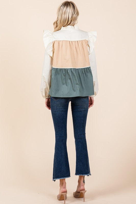regular size, standard, young contemporary, contemporary, poplin, woven, color block, tiered, blouse, top, v-neck, split neck, ruffle trim, optional self-tie, long sleeve, elastic cuff, trendy, cute, stylish, fashionable, daily wear, everyday wear, transitional, fall, winter, spring, summer, fw, ss, women's clothing, women's apparel, women's wear