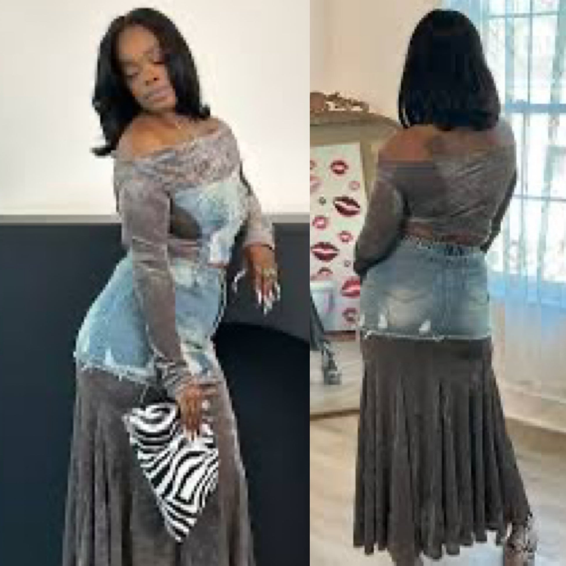 Make a bold statement with this two-piece ensemble featuring a captivating blend of textures and styles. The set includes an off-shoulder velvet long-sleeve crop top with a structured denim-inspired bustier overlay. The top is paired with a high-waisted distressed denim mini-skirt layered over a flowing velvet maxi skirt, creating a unique combination of edgy and elegant.