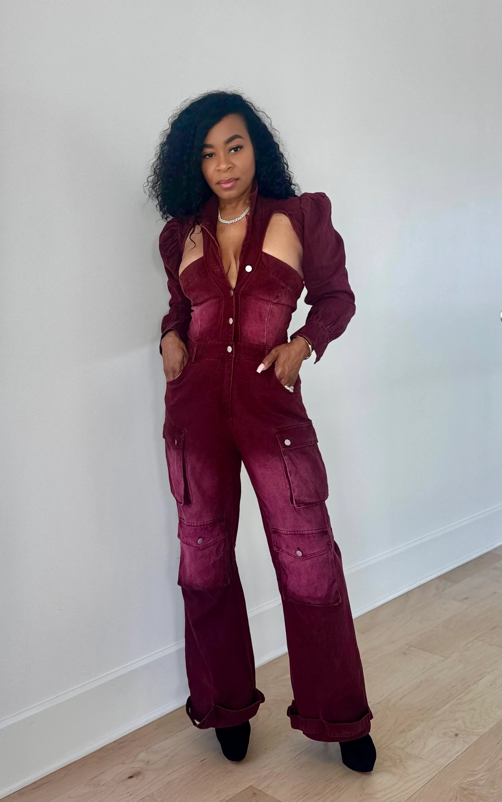Wine Utility Denim Jumpsuit | Puff Sleeve Cargo Jumpsuit