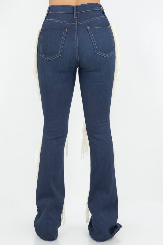 Unleash your inner cowgirl with these show-stopping bootcut denim jeans featuring bold suede fringe detailing. Proudly made in the USA, these jeans bring modern Western fashion to life with layered fringe that moves with every step. The high-waisted fit and flattering bootcut leg make them the perfect pair for concerts, rodeos, festivals, or a standout streetwear look.