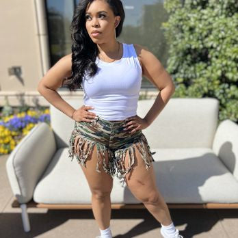 Short déchiqueté camouflage à franges
