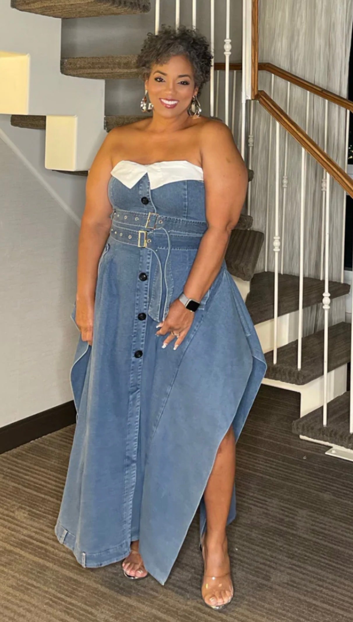The Chic Reinvented Trench Maxi Dress is where timeless sophistication meets contemporary edge. Designed to mimic the classic trench coat silhouette, this strapless maxi dress features a structured button-down front, wide belt detailing for a cinched waist, and oversized pockets for a functional yet fashion-forward touch. The contrast fold-over collar adds an unexpected pop of refinement, while the full A-line skirt creates a dramatic, structured finish.