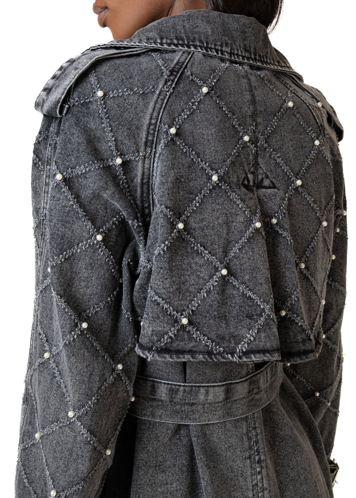 Elevate your wardrobe with our Distressed Denim Trench Coat-a modern twist on a timeless classic. This long, tailored coat combines edgy aesthetics with elegant craftsmanship. Featuring an intricately quilted pattern on the sleeves adorned with delicate studs, it offers just the right amount of attitude and flair.