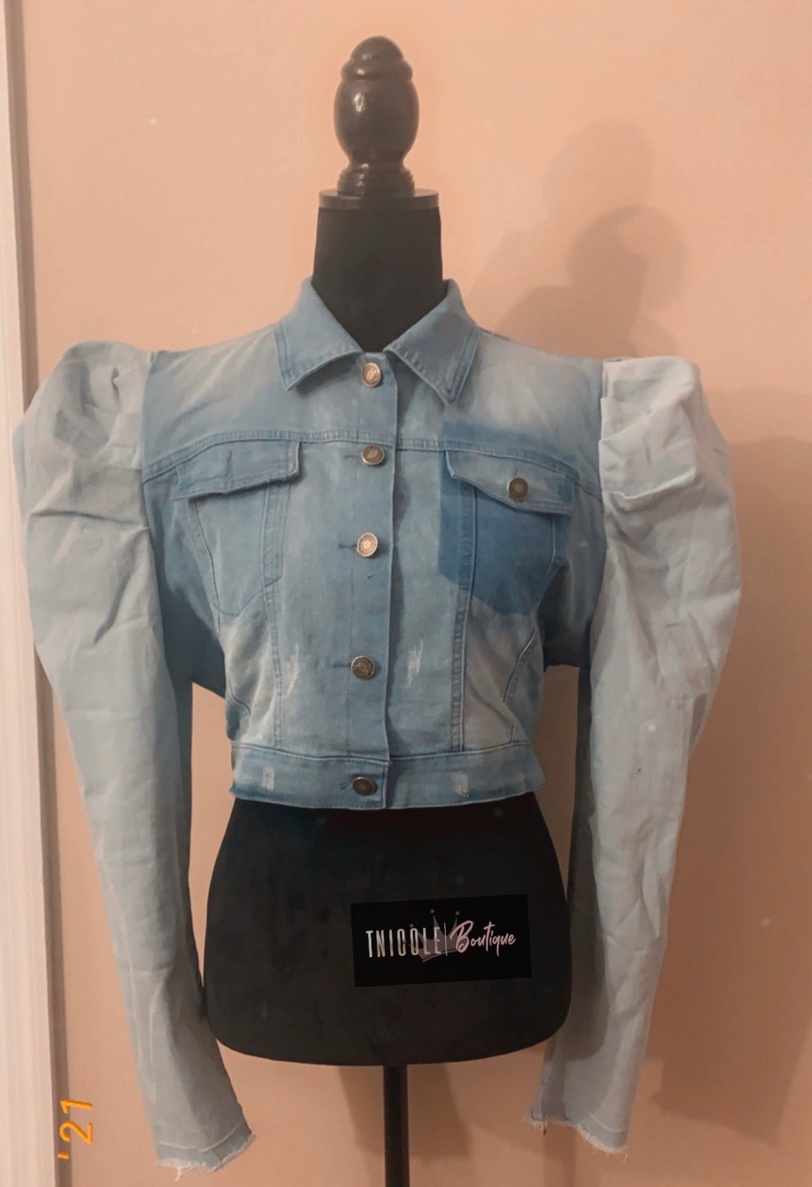 Veste en jean bicolore avec audace. Les manches bouffantes ajoutent une touche girly que toute veste en jean devrait avoir !