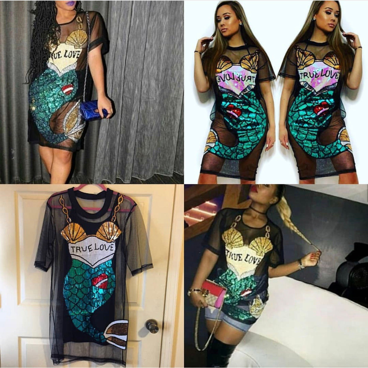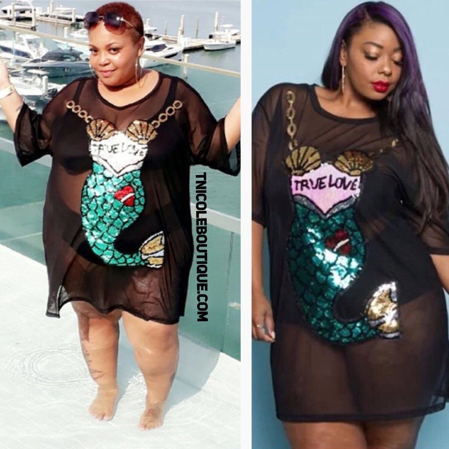 Ce magnifique haut présente un graphisme de sirène à paillettes très brillantes qui indique « True Love ». Le haut est en maille et TRÈS extensible ! Parfait à porter par-dessus votre legging ou votre maillot de bain préféré !
