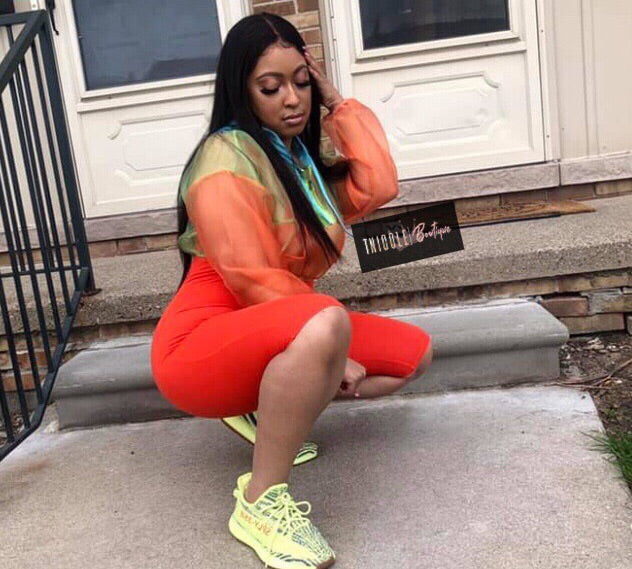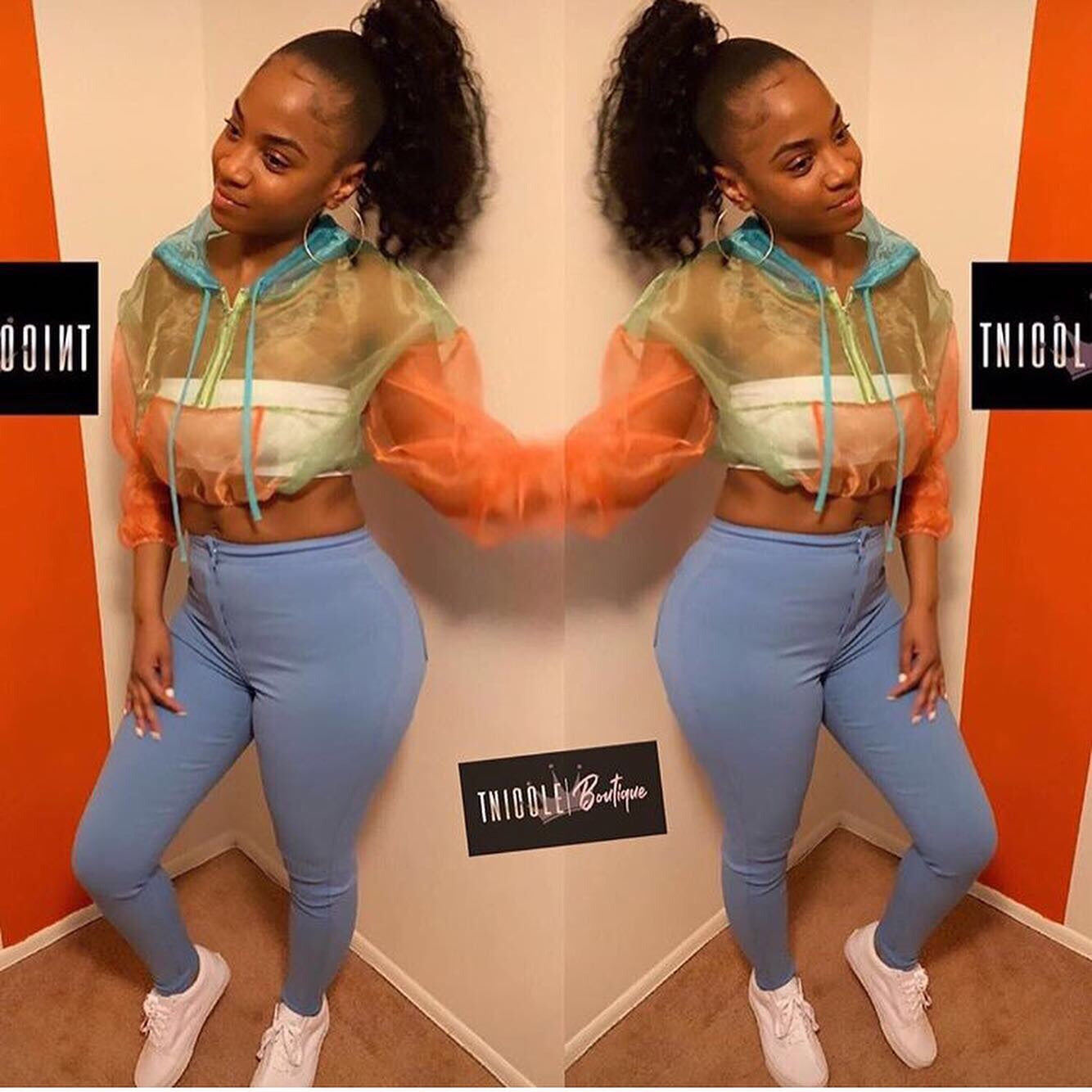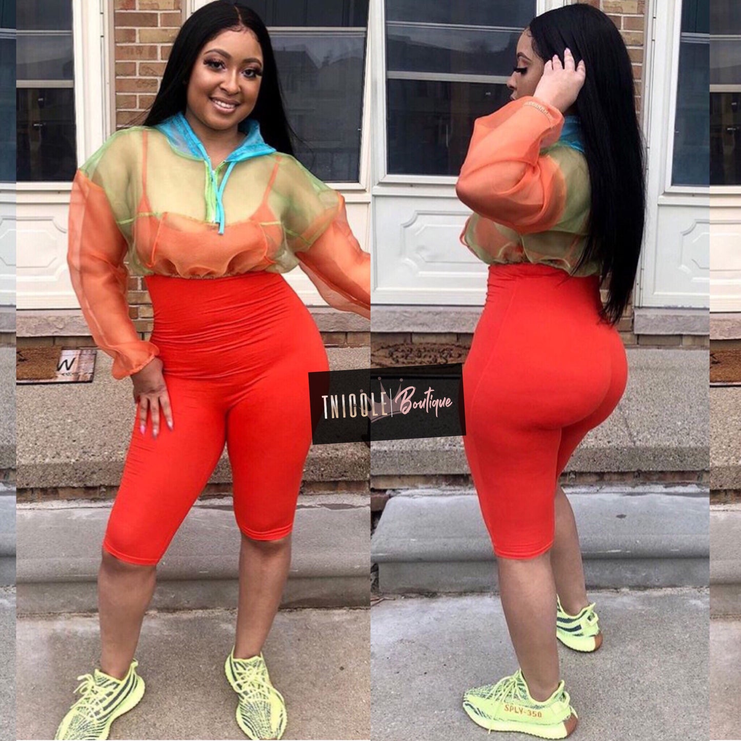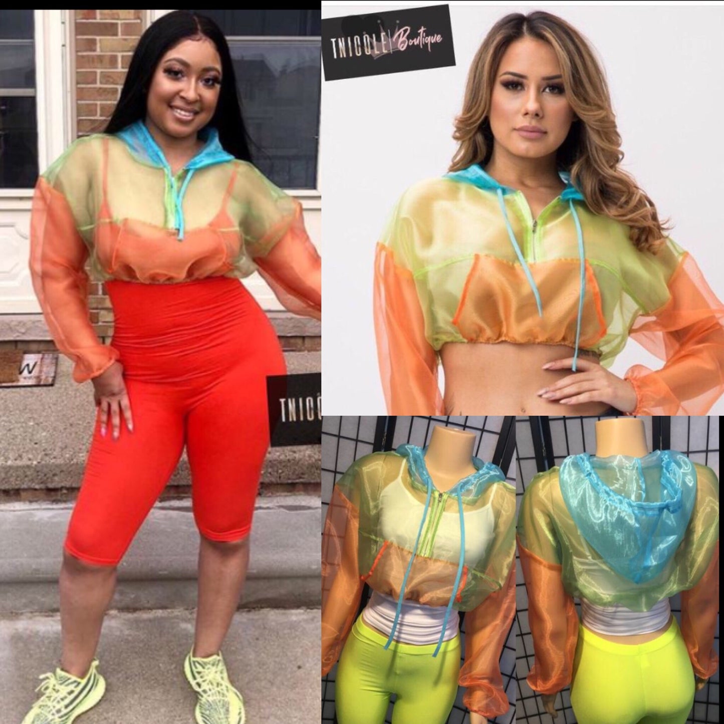 Style SURCHARGE avec cette veste courte transparente fluo ! Color block avec du bleu, du vert fluo et de l'orange ! Associez le legging fluo pour un look officiel !