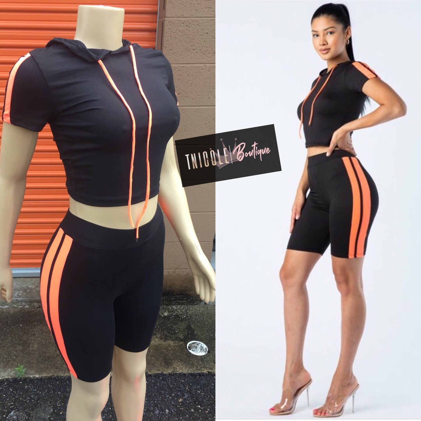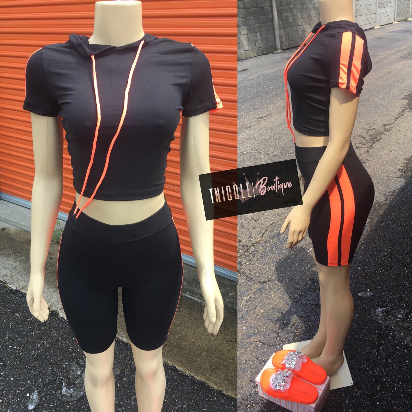Ensemble haut court à capuche et short de motard mignon et sportif. Associez-le aux claquettes Neon Orange Glam Rhinestone pour un look éclairé !