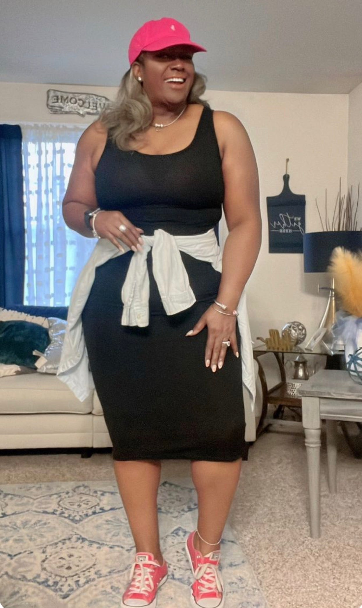 A closet MUST HAVE. A staple dress that can be dressed up or down. This dress features racerback, stretchy, round neckline, thick shoulder straps. Can be worn midi length or above the knee.
