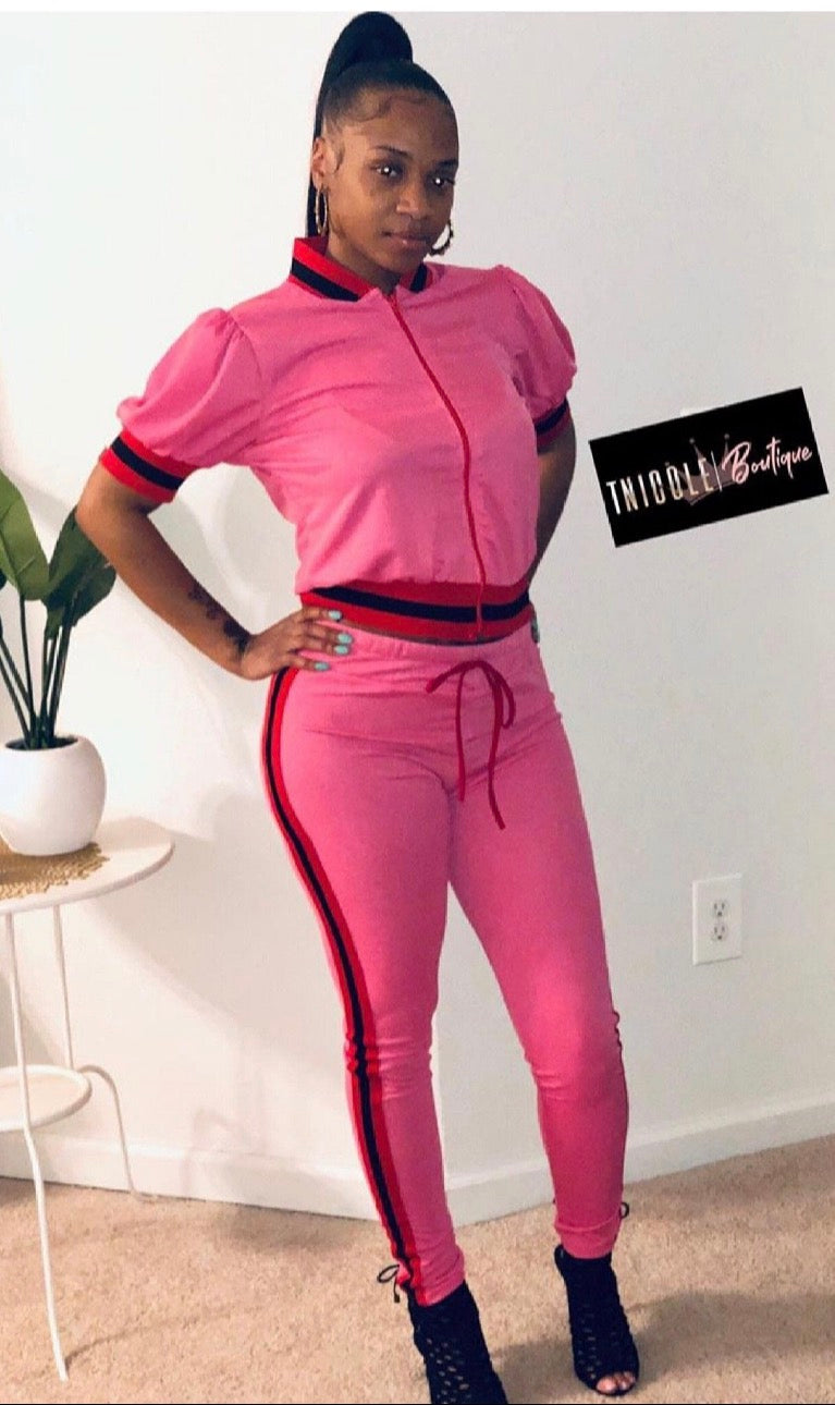 Turn heads in this stylish athleisure matching set, perfect for fashion-forward women who love comfort and edge. This two-piece track set features a short-sleeve bomber-style jacket with trendy puff sleeves and contrast ribbed trim on the collar, waist, and sleeves. The matching high-waist jogger pants include a drawstring waist and bold side racing stripes that create a sleek, slimming look.