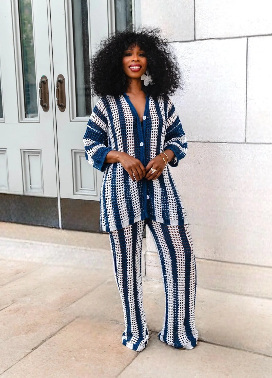 Designed with laid-back elegance in mind, this sheer stripe polo knit pants set is your go-to for warm-weather getaways and breezy days by the coast. Featuring a relaxed-fit polo top with 3/4 length sleeves and lightweight knit pants, this two-piece set delivers comfort without sacrificing style. The sheer striped texture adds a touch of sophistication, while the soft, stretch-infused fabric ensures an effortless fit. Available in three versatile color options, it’s a chic, coordinated look ideal for vacation, beach strolls, or resort lounging.
